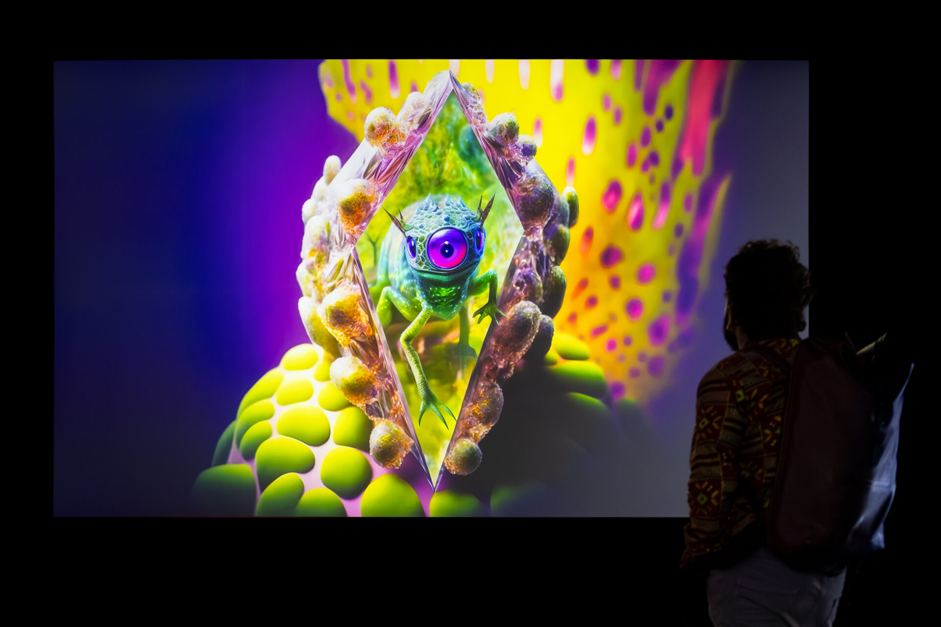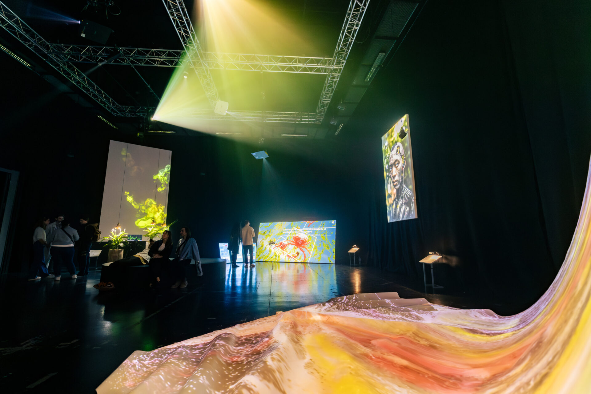 Peintures immersives dont les personnages se mettent à chanter, voix qui se métamorphosent en paysages, plantes qui alimentent des images, ou encore, fictions qui ressuscitent le passé et visualisent l’avenir… Chaque œuvre présentée repousse les limites de la perception et de la réalité, révélant des mondes alternatifs où l’humain cohabite avec la nature et les machines.